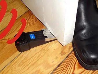 - beim Versuch die Tür zu öffnen wird die Metallplatte des Stoppers heruntergedrückt, die Türe mechanisch gegen den Täter blockiert und gleichzeitig Alarm ausgelöst.